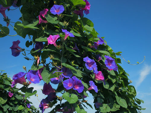 まず、出迎えてくれるのは、ノアサガオの変種オーシャンブルーのアーチ。朝顔と言えば夏のイメージなので、コスモスとの共演は、意外です。